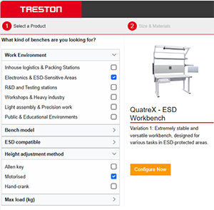 Wählen Sie zunächst das Produkt aus, das Sie konfigurieren möchten: Einen Arbeitstisch oder einen Multiwagen. Unser 3D-Konfigurator umfasst verschiedene Industrie-Arbeitstische und den neuen, vielseitig zu konfigurierenden, Treston Industrie-Multiwagen.