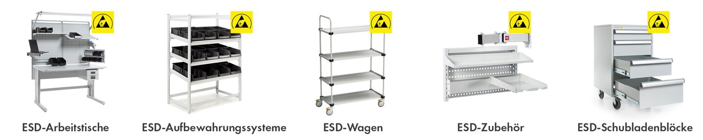 Alle Zubehörteile von Treston mit der Endung „-49“ sind ESD-konform – dazu gehören u. a. Ablagen, Aufbauprofile, Schubladenblöcken oder Aufhängeleisten. Sie sind mit ESD-Pulverbeschichtung versehen und für den Einsatz in EPAs geeignet.