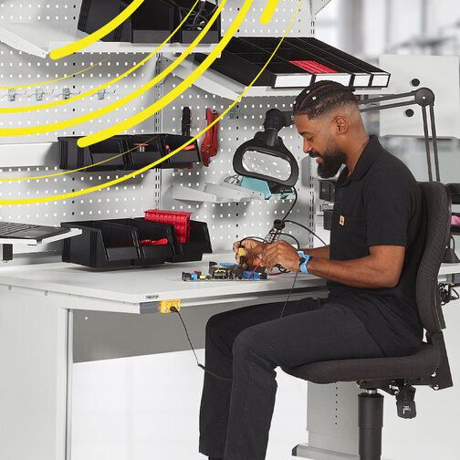 In ESD-Bereichen sind spezielle Stühle erforderlich: Sie verfügen über leitfähige Rollen und ableitfähige Materialien. So bleibt der Mitarbeiter auch im Sitzen geerdet.