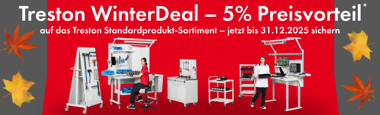 28.10.2025Mit dem Treston WinterDeal starten wir in die kalte Jahreszeit und bieten Ihnen 5% Preisvorteil auf das gesamte Treston Standardprodukte-Sortiment.* Nutzen Sie die Gelegenheit, Ihre Arbeitsplatzprojekte für 2026 frühzeitig zu planen. Ob ergonomische Arbeitsplätze, ESD-sichere Systeme oder modulare Ausstattung – Treston Lösungen kombinieren Qualität, Funktionalität und Langlebigkeit.